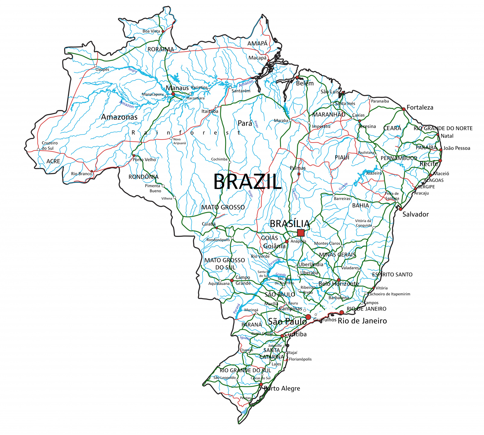 The northeast, east and southeast coasts of Brazil are washed by the Atlantic Ocean. The territory of the country is densely cut by river systems. The largest of them is the Amazon basin, washing the northern and central parts of the country. The Amazon is the second largest river in the world and the largest basin in terms of size.