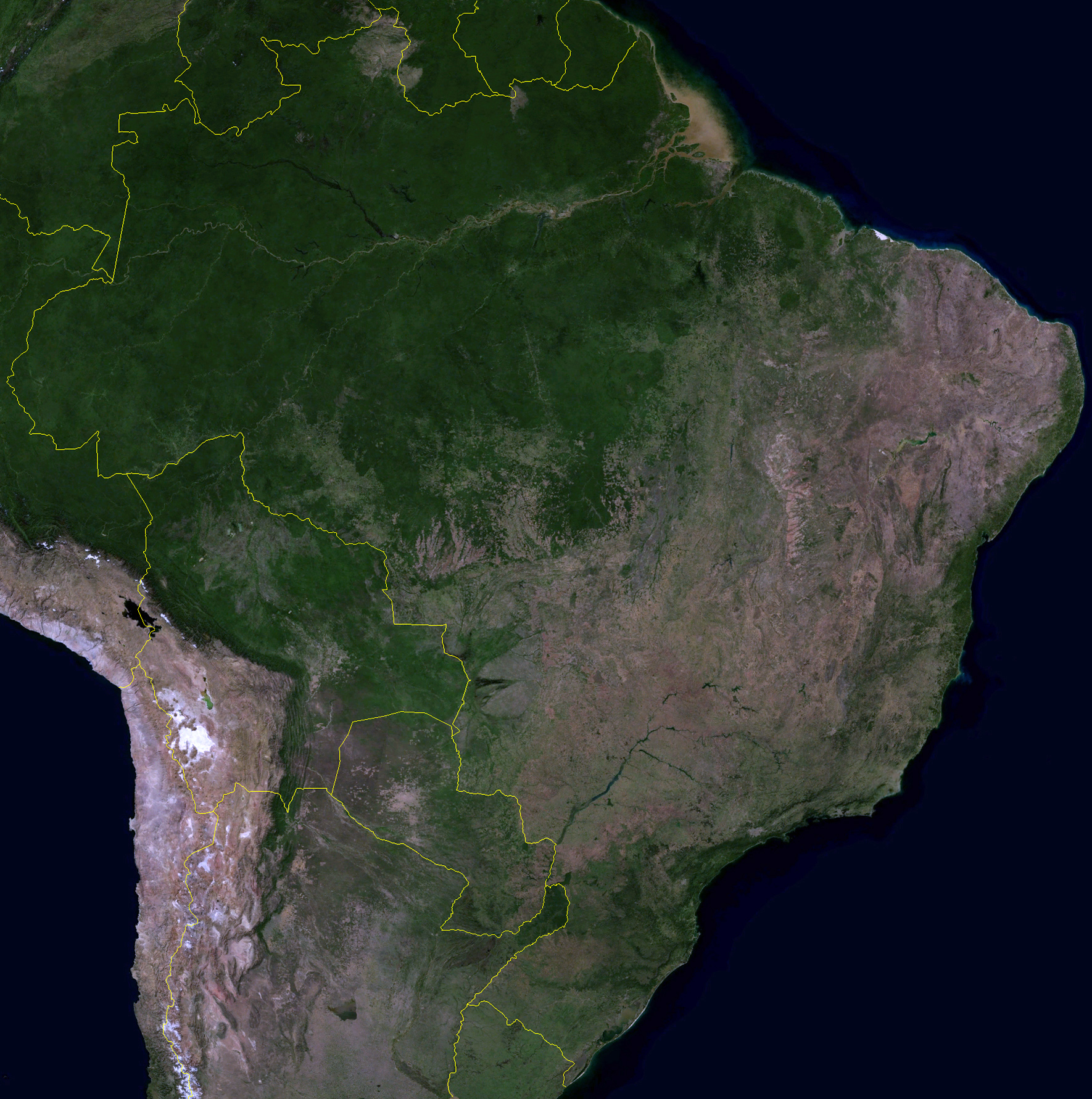 To the south and northeast of the Amazonian lowland rises the Brazilian Plateau. Approaching the Atlantic coast, it breaks off abruptly, forming the Atlantic Lowland. The southeastern part of the plateau consists of a complex system of ridges. Here is the highest point of the plateau – Mount Bandeira 2890 m.