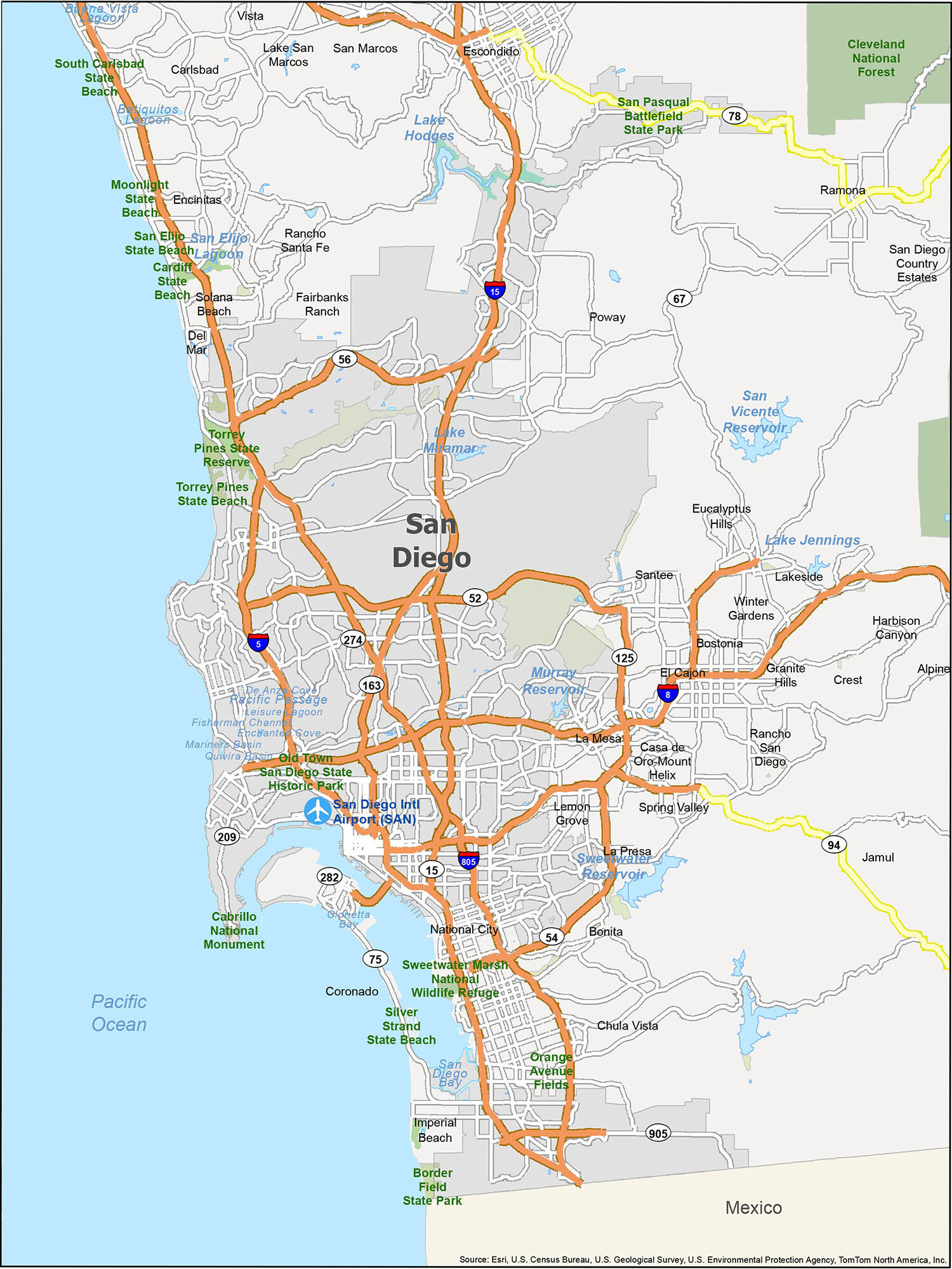 On the political map of San Diego, you can see its sprawling cities and towns that are separated by mountains and deserts. Its borders are defined by several rivers which separates it from adjoining regions such as Oregon, Arizona and Baja California Sur. On the physical map of this city you can see its many natural features including beaches and wetlands, hills, lowlands, rivers and valleys with lots of green vegetation around them. The reference map of San Diego serves as a starting point in the world of traveling around the city.